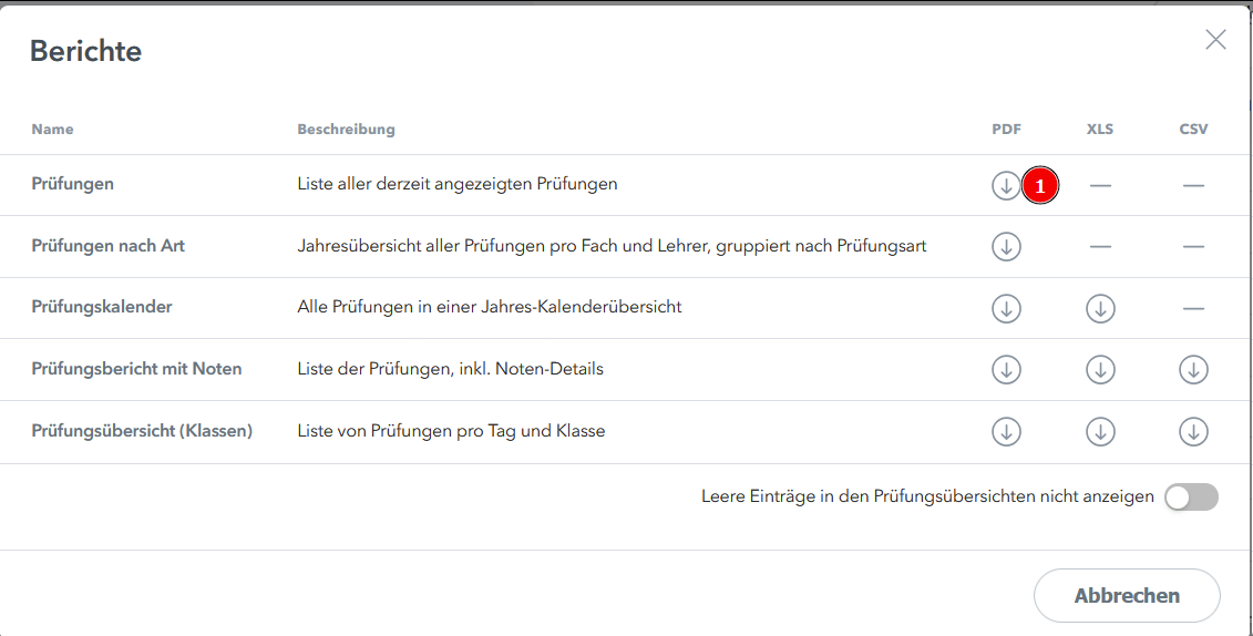 In der Liste findest du nun die geplanten Klassenarbeiten für den gewählten Zeitraum. Über den Button "Berichte" kannst du dir diese Ansicht auch als pdf herunterladen (1) um sie beispielsweise auszudrucken.