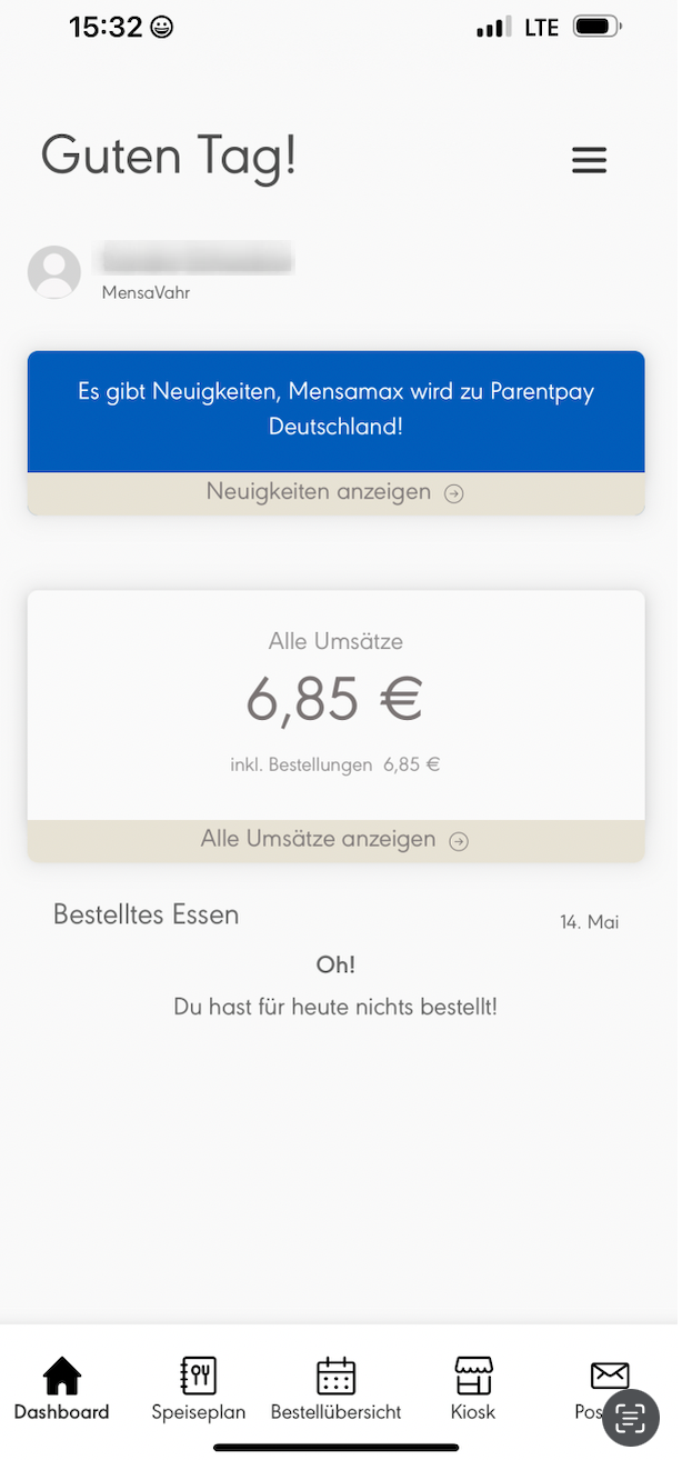 wenn Sie sich bei MensaMaxbyParentPay angemeldet haben, können Sie auch die zugehörige App nutzen. So haben Sie auf Ihrem Smartphone oder Tablet eine bessere Übersicht. Einmal über das Guthaben und (wenn hinterlegt) über die Speisekarte.