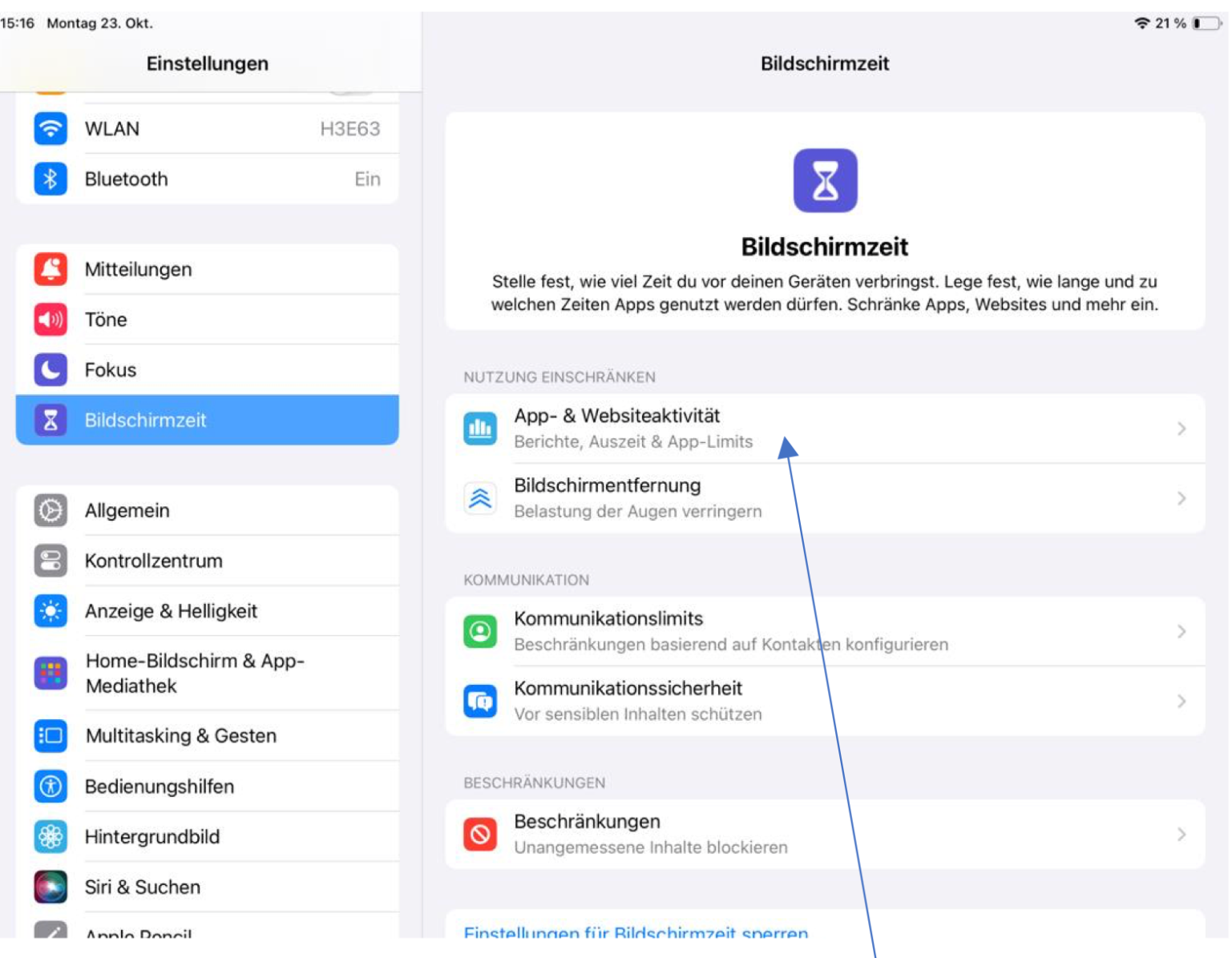 Eventuell müssen Sie zunächst unter "App- & Websiteaktivität" die Bildschirmzeit aktivieren.