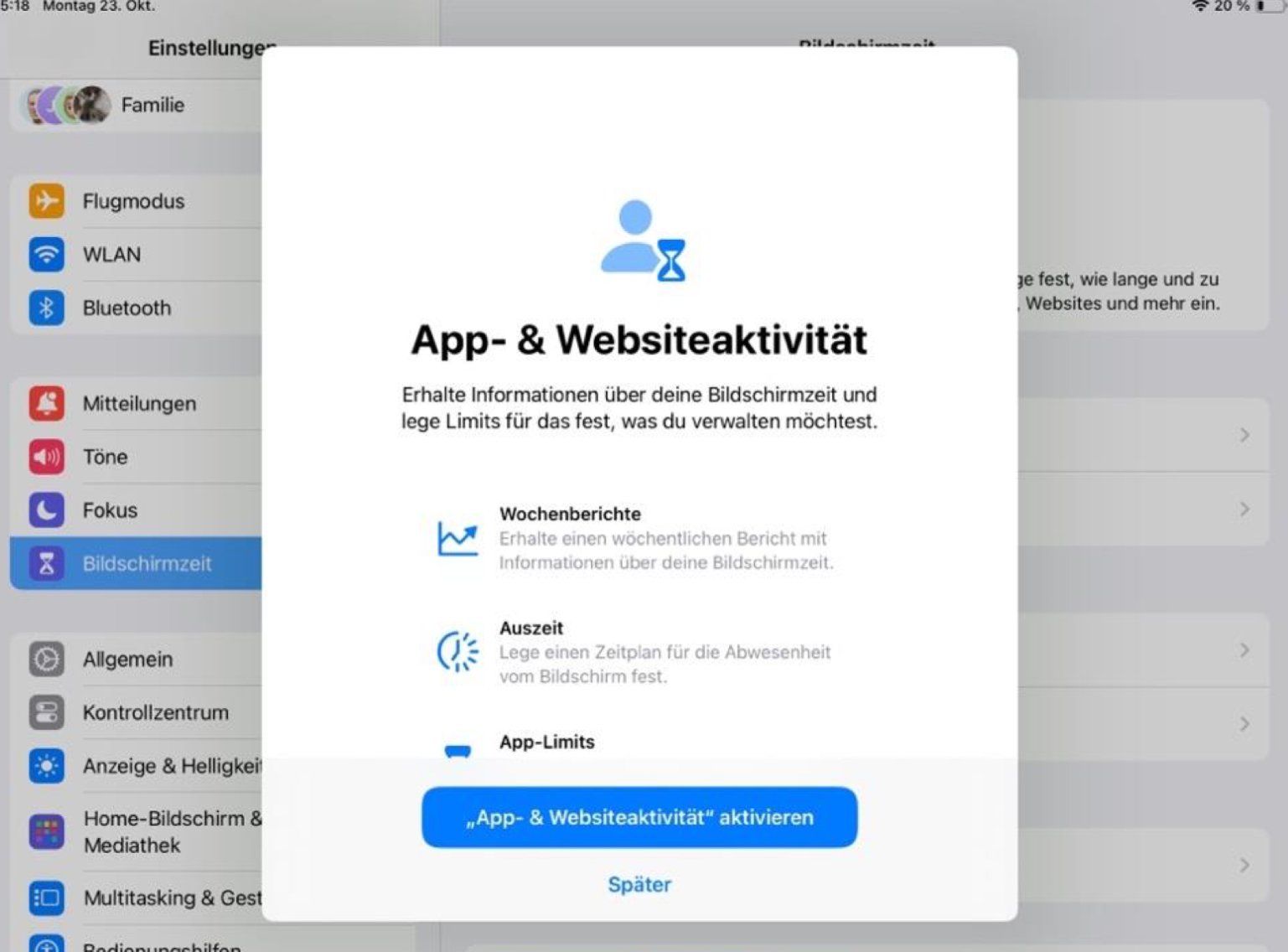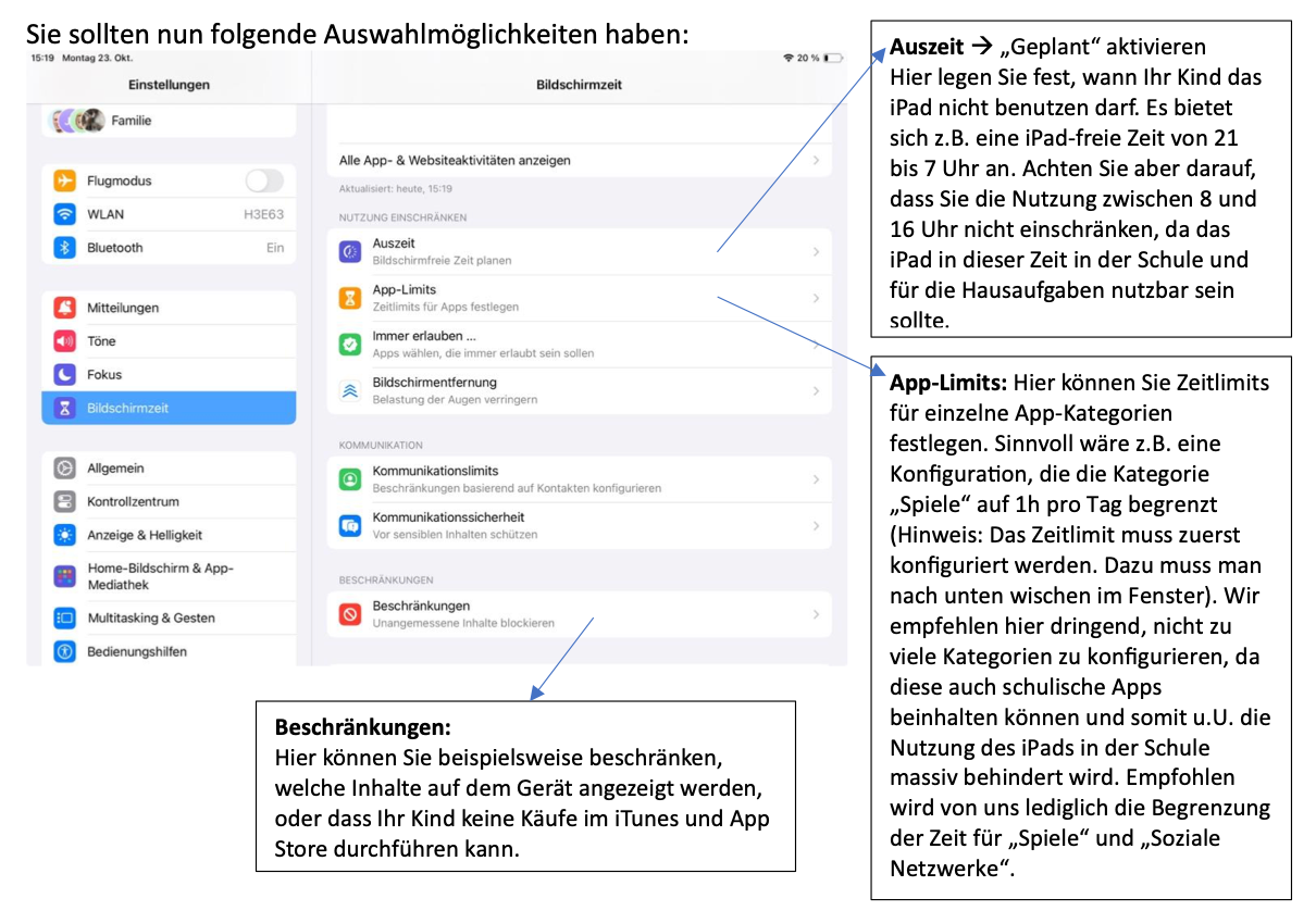 Um einen Überblick über die Nutzungsdauer des iPads durch Ihr Kind zu erhalten, empfehlen wir dringend die Bildschirmzeit im iPad zu konfigurieren. Dies ist sehr einfach und schnell erledigt. Diese Anleitung soll Sie dabei unterstützen.