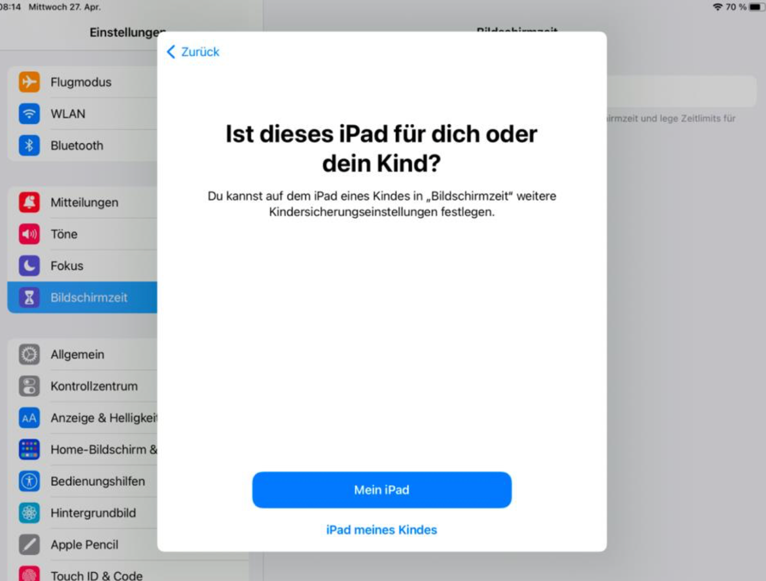 Bei der Frage, ob das iPad Ihr "eigenes iPad" oder das "iPad meines Kindes" ist, wählen Sie bitte unbedingt "iPad meines Kindes" aus.
